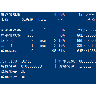CosyOS是一款来自中国的开源实时操作系统,从经典的8051内核,到流行的Arm Cortex-M内核,均可实现全局不关总中断、零中断延迟,适用于对系统实时性及中断响应速度有较高要求的场合。CosyOS以极具浪漫主义色彩的宏定义,实现了高度的面向对象及良好的易用性。